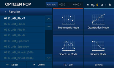 OPTIZEN POP共提供4種測量模式 (光度測量模式, 定量模式, 光譜模式, 動力學模式), 用戶可根據測量目的選擇使用相應的模式。用戶可以利用設備中內置的電腦軟件和觸屏界面, 應用程序來簡便地使用設備。